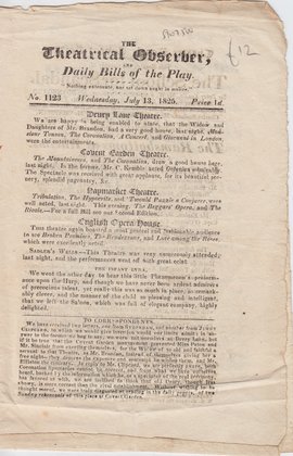 Notes:Periodical, probably daily, brief reviews and play bill for the Royal Theatres Covent Garden and Drury Lane, London. Form: single sheet folded once.