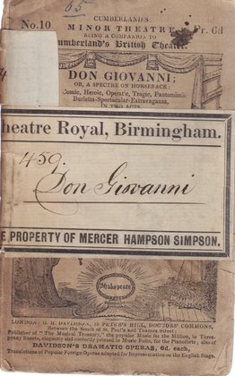 Marginalia: Cover [book-plate] 'Theatre Royal, Birmingham. | 459. | Don Giovanni | THE PROPERTY OF MERCER HAMPSON SIMPSON.' Cover [book-plate] '54'. Cover '65' [blue ink]. Front blank page '$25-'.