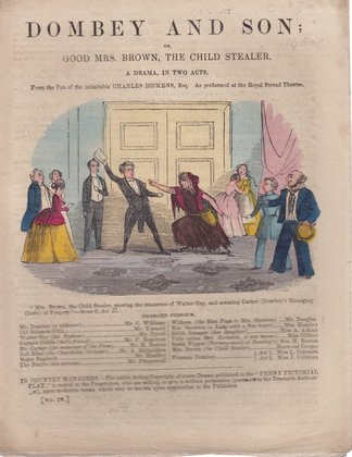 Notes:Full-title: DOMBEY AND SON ; OR, GOOD MRS. BROWN, THE CHILD STEALER. A DRAMA, IN TWO ACTS. FROM THE PEN OF THE INIMITABLE CHARLES DICKENS, ESQ. AS PERFORMED AT THE ROYAL STRAND THEATRE. Adapted from Charles Dickens for Royal Strand Theatre. a 'PENNY PICTORIAL PLAY'.