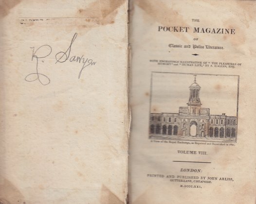 Full-title: THE POCKET MAGAZINE OF CLASSIC AND POLITE LITERATURE. WITH ENGRAVINGS ILLUSTRATIVE OF “THE PLEASURES OF MEMORY” AND “HUMAN LIFE,” BY S. ROGERS,ESQ. VOLUME VIII.