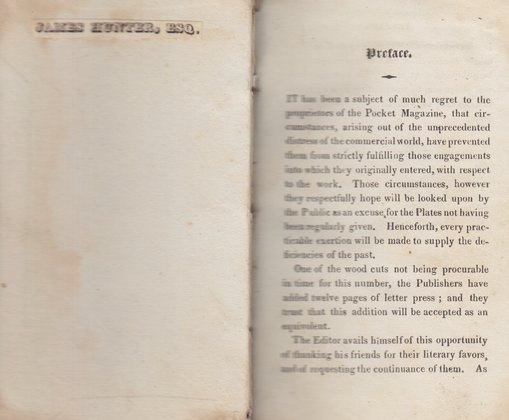 Binding: Black, half calf. Front and back covers marbled board. SPINE: [gilt-tooled] ‘(lines) | (decorative emblem) | (lines) | ARLISS’S | POCKET | MAGAZINE. | (lines) | (decorative emblem) | (lines) | VOL. IV. | N.S. | (lines) | (decorative emblem) | (lines)’.