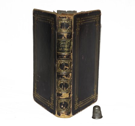 Binding: Purple, full calf. Front and back covers gilt/blind-tooled decorative border. SPINE: [gilt-tooled] '(line) | (decorative design) | (line) | '(2 lines) | POLLOK'S | COURSE | OF TIME | (2 lines)' (on black calf) | (line) | (decorative design) | (decorative design) | (decorative design) | (line)'.