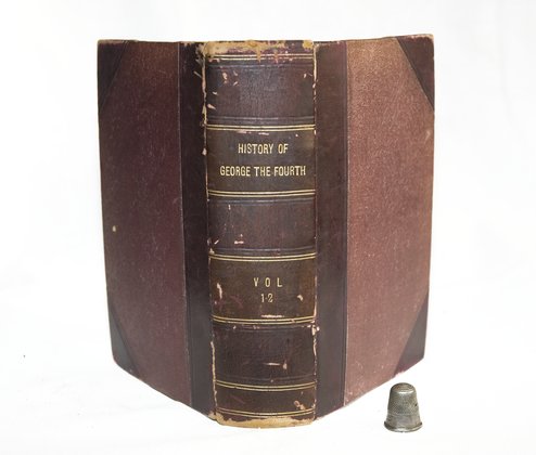 Binding: Purple, half calf. Front and back covers blind-tooled burgundy cloth. SPINE: [gilt/blind-tooled] '(lines) | (lines) | HISTORY OF | GEORGE THE FOURTH | (lines) | (lines) | VOL | 12 | (lines) | (lines) | (lines)'.