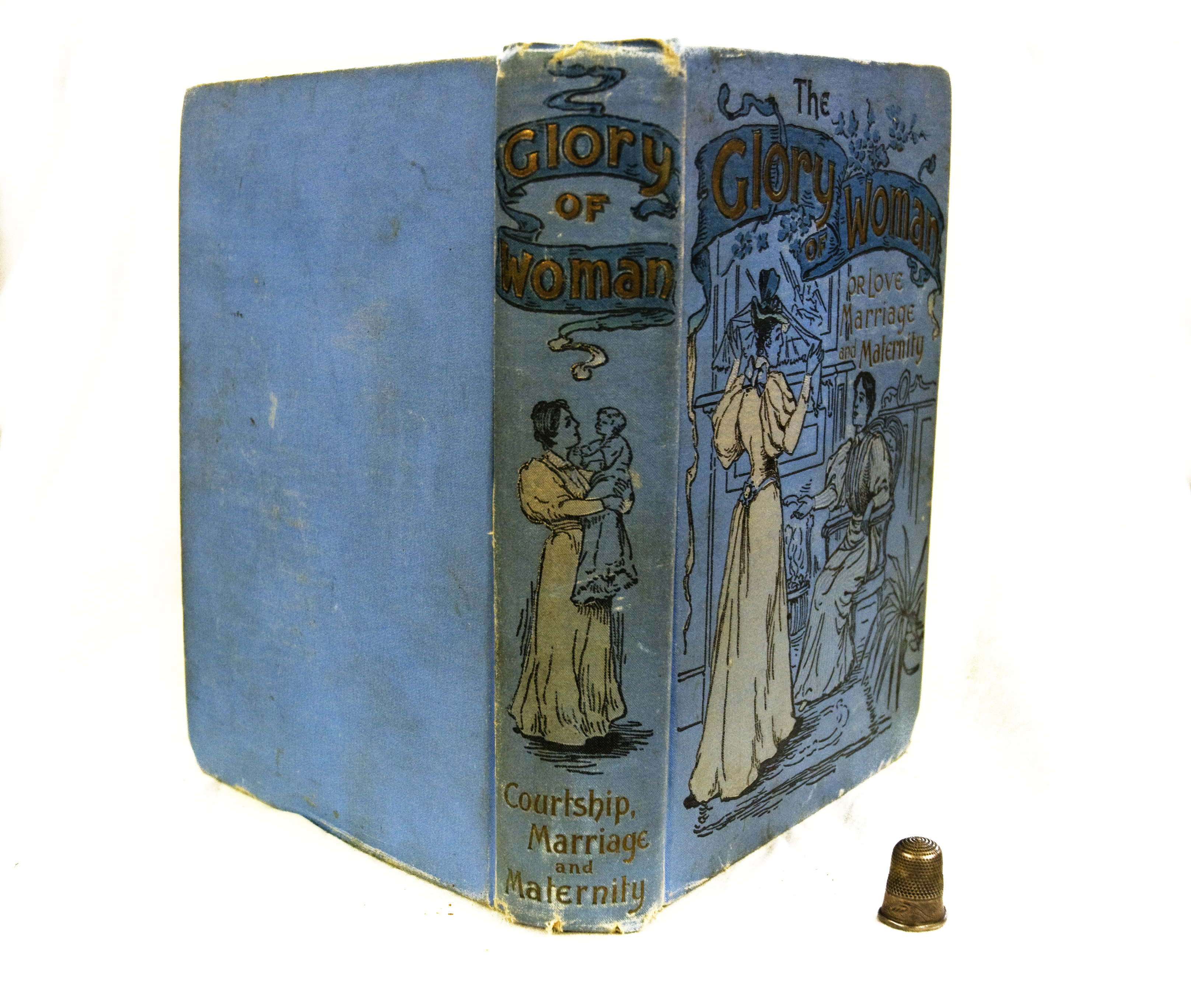 Binding: Blue, full cloth. Front cover title and image. SPINE: 'Glory | OF | Woman | (image) | Courtship, | Marriage | and | Maternity'.