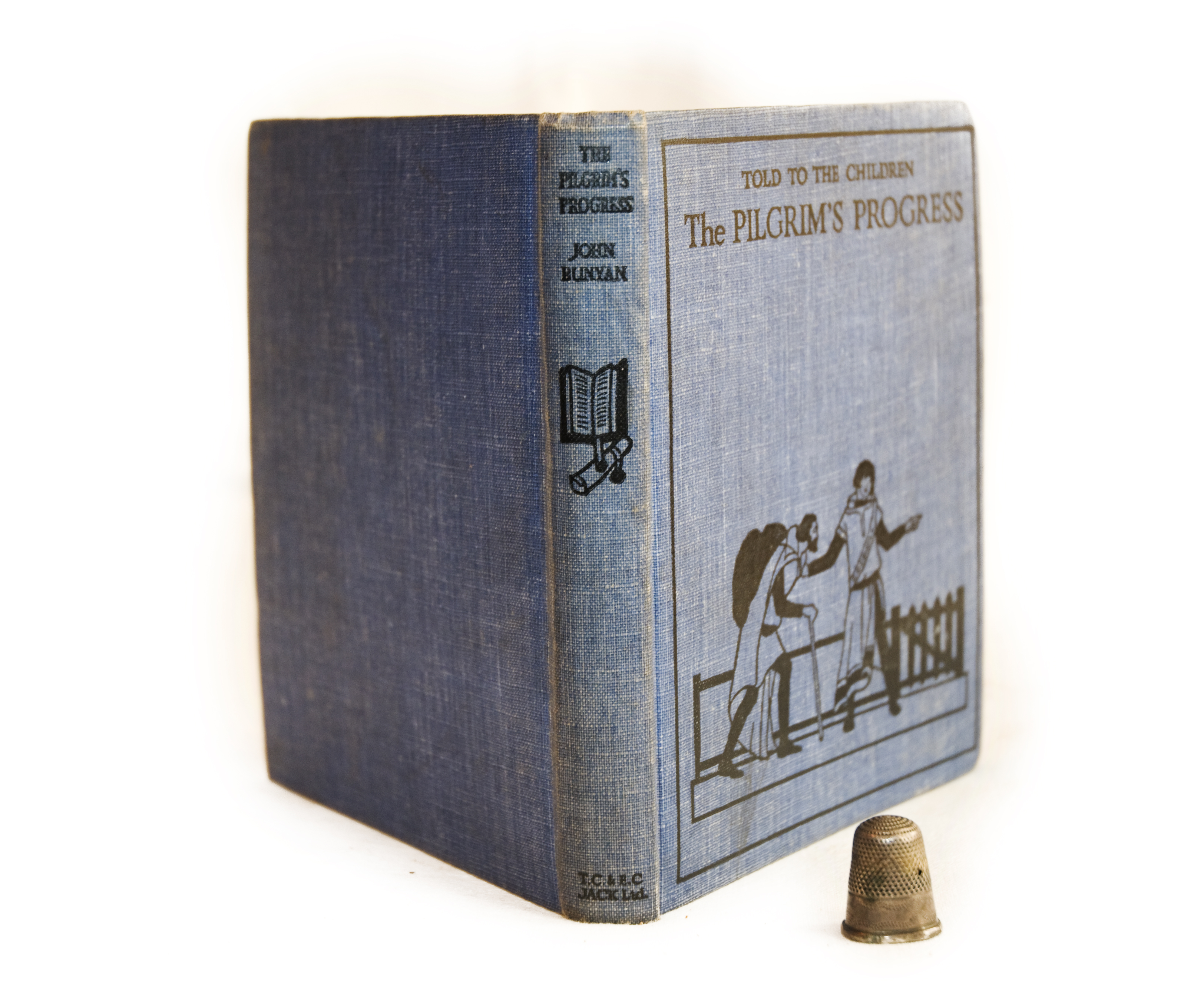 Binding: Blue, full cloth. Front cover 'TOLD TO THE CHILDREN | The PILGRIM'S PROGRESS | (image: Goodwill helping pilgrim)'. SPINE: 'THE | PILGRIM'S | PROGRESS | JOHN | BUNYAN | (image: book and scroll) | T.C. & E.C. | Jack Ltd.'