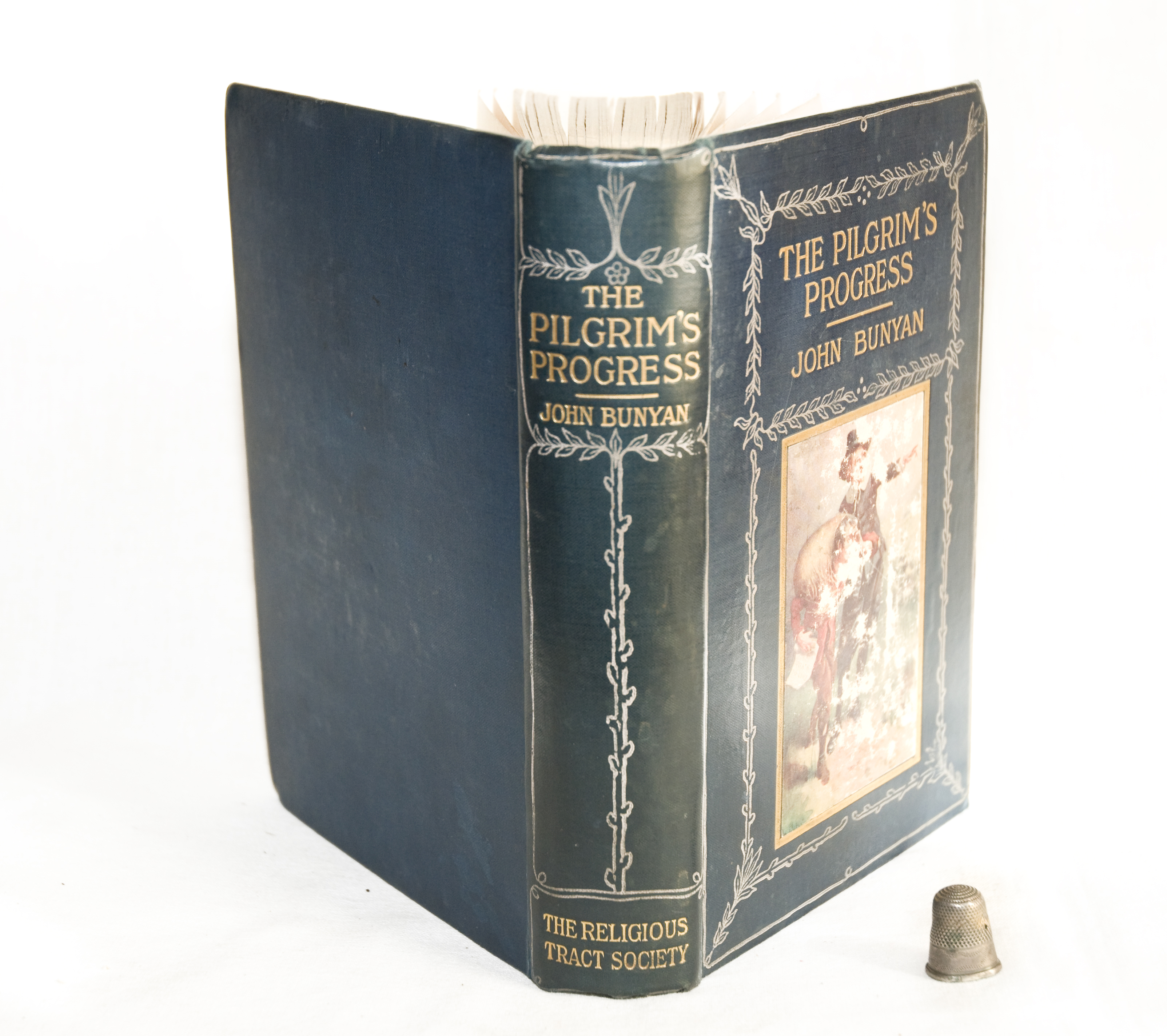 Binding: Blue, full cloth. Front cover 'THE PILGRIM'S | PROGRESS | JOHN BUNYAN' (within decorative border and below colour image). SPINE: '(decoration) | THE | PILGRIM'S | PROGRESS | (line) | JOHN BUNYAN | (decoration) | THE RELIGIOUS | TRACT SOCIETY'.