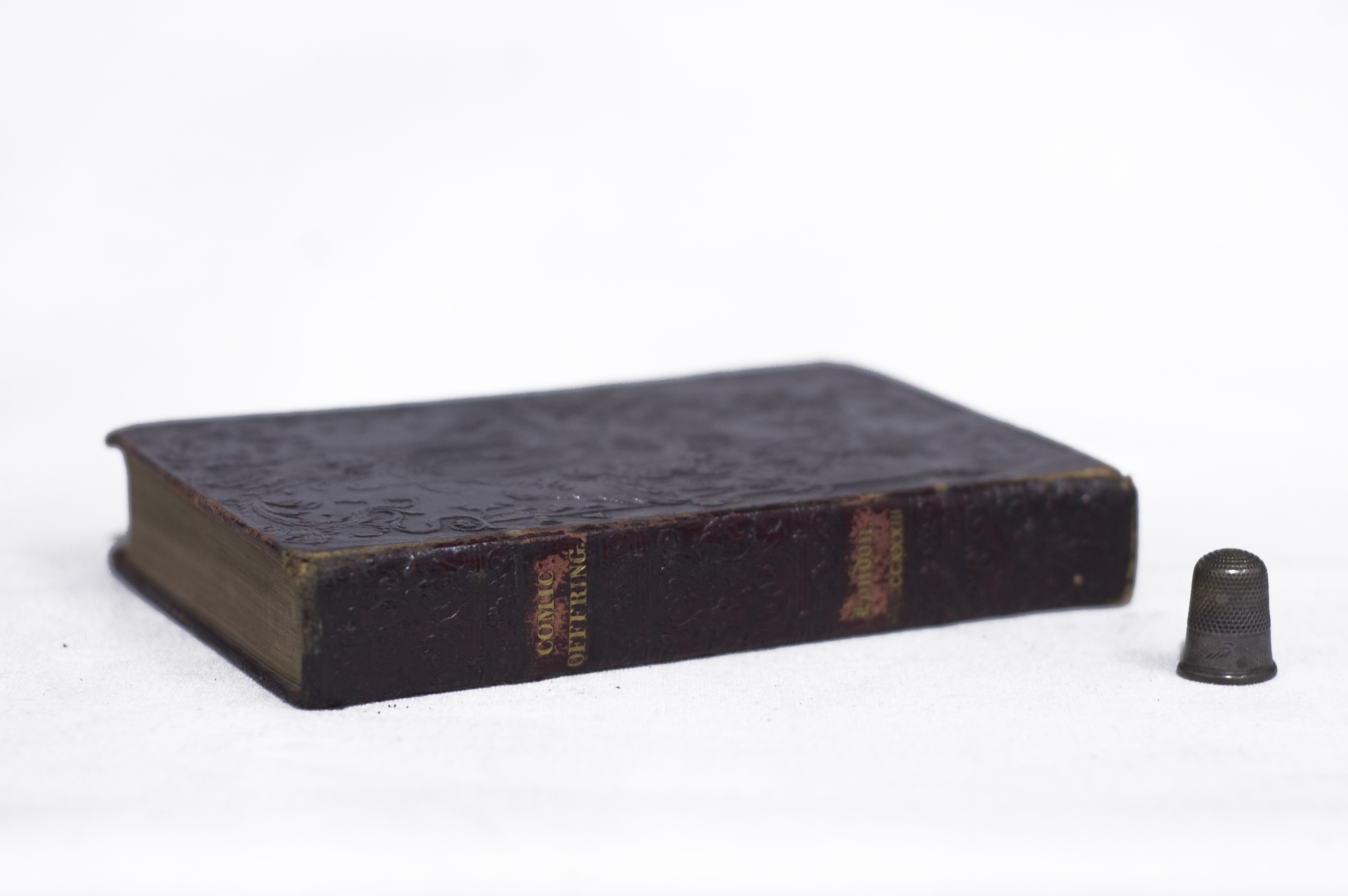 Binding: Burgundy, full calf. Front and back covers blind tooled, intricate design. Spine (same blind tooled design): [gilt-stamped] 'COMIC | OFFERING | London. | MDCCCXXXIII'.