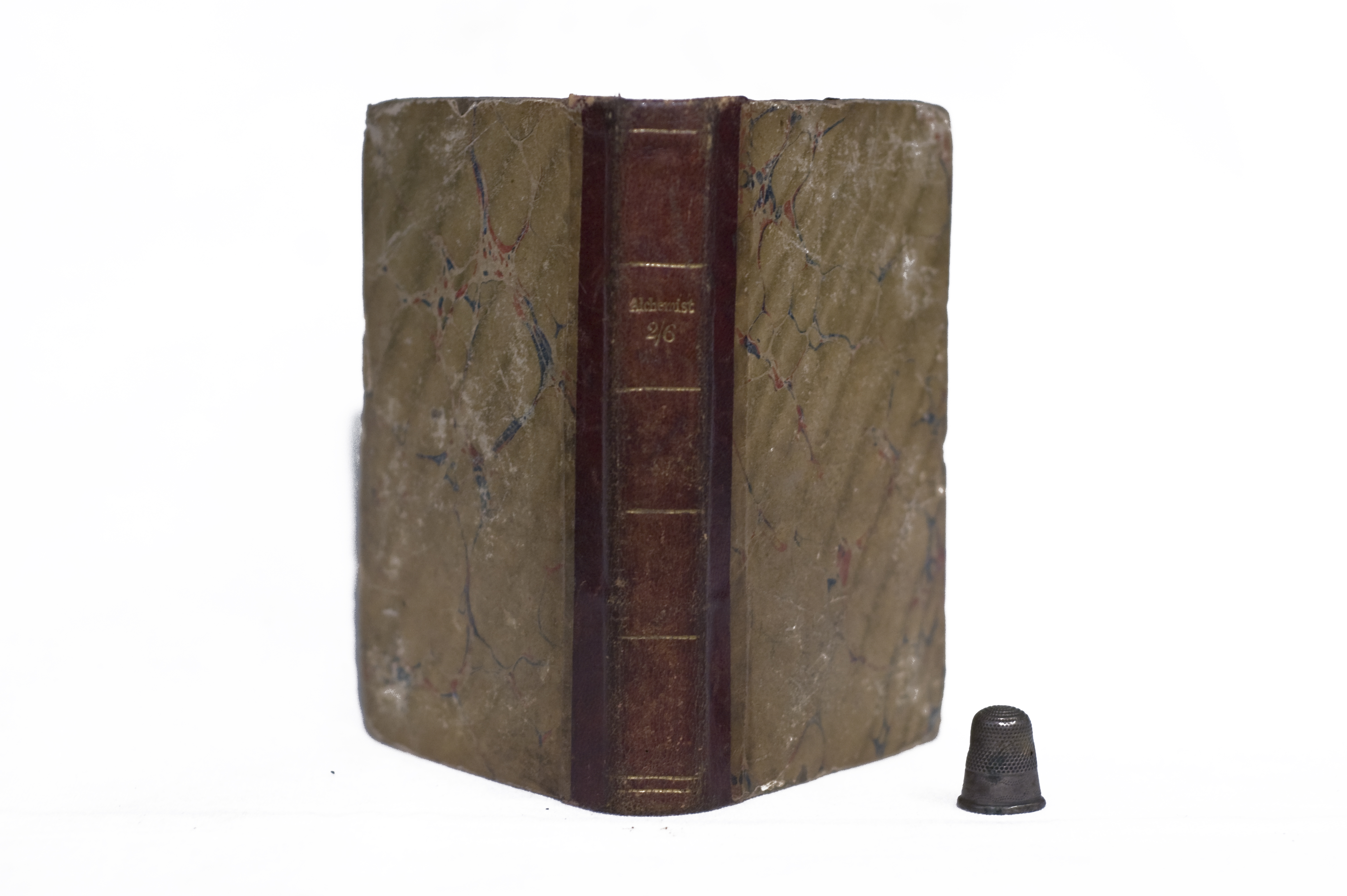 Binding: Red, quarter calf. Front and back covers marbled board. SPINE: [gilt-tooled] '(line) | (line) | Alchemist | 2/6 | (line) | (line) | (line) | (line) | (line)'.