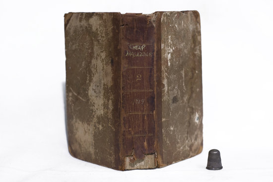 Binding: Brown, half calf. Front and back covers marbled board. SPINE: [gilt-tooled] '(line) | 'CHEAP | MAGAZINE' (ink) | (line) | 2 | line) | '1814' (ink) | (line) | (line)'.