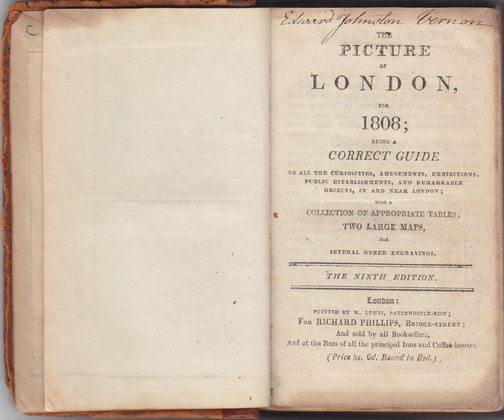 New works included single- or multi-volume guidebooks or reference works. Picture of London was expensive at five shillings and sixpence in 1808, and even more so at nine shillings in 1818. However, 1808 was the ninth edition and 1818 the nineteenth, indicating steady demand, likely as a result of increasing travel to, from, and within London. If the copy shown here is any indication, it was well used.