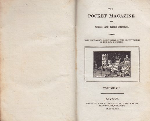 14. After publishing a didactic poem in 1799, entitled The Pleasures of Hope, and another satire in 1785, called The News-Paper, Crabbe took a twenty-two year break from publishing. He returned in 1807 with Poems, and in the following years wrote The Borough (1810), Tales (1812), and Tales of the Hall (1819). The Borough is best remembered today as the source text for the Benjamin Britten opera, Peter Grimes. The major success of Peter Grimes in 1945 has since sparked renewed interest in Crabbe, thus allowing his writing to achieve a broader, contemporary readership. This volume of The Pocket Magazine of Classic and Polite Literature (v.7: 1821) features engravings from Crabbe’s Poems, including The Borough.