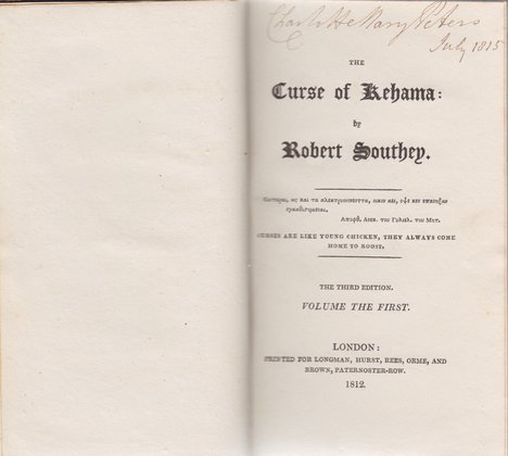 23. In 1810, Southey followed up on the publication Madoc with the completion of another epic poem: The Curse of Kehama. As was also the case with Madoc and Mary, The Maid of the Inn, the origins of The Curse of Kehama date back to Southey
