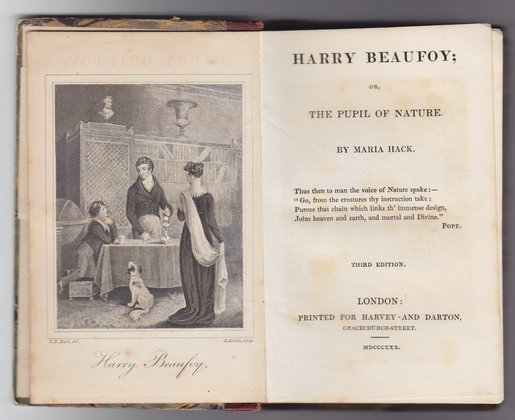 13. Following upon increased middle-class reading of circulating library novels, new stories for children imitated adult novels; they were longer, published in book form, and employed popular fictional genres. Harry Beaufoy; or, the Pupil of Nature (London: Harvey and Darton, 1830) by Maria Hack, for example, is adapted for children and based on the work of Dr. Paley.